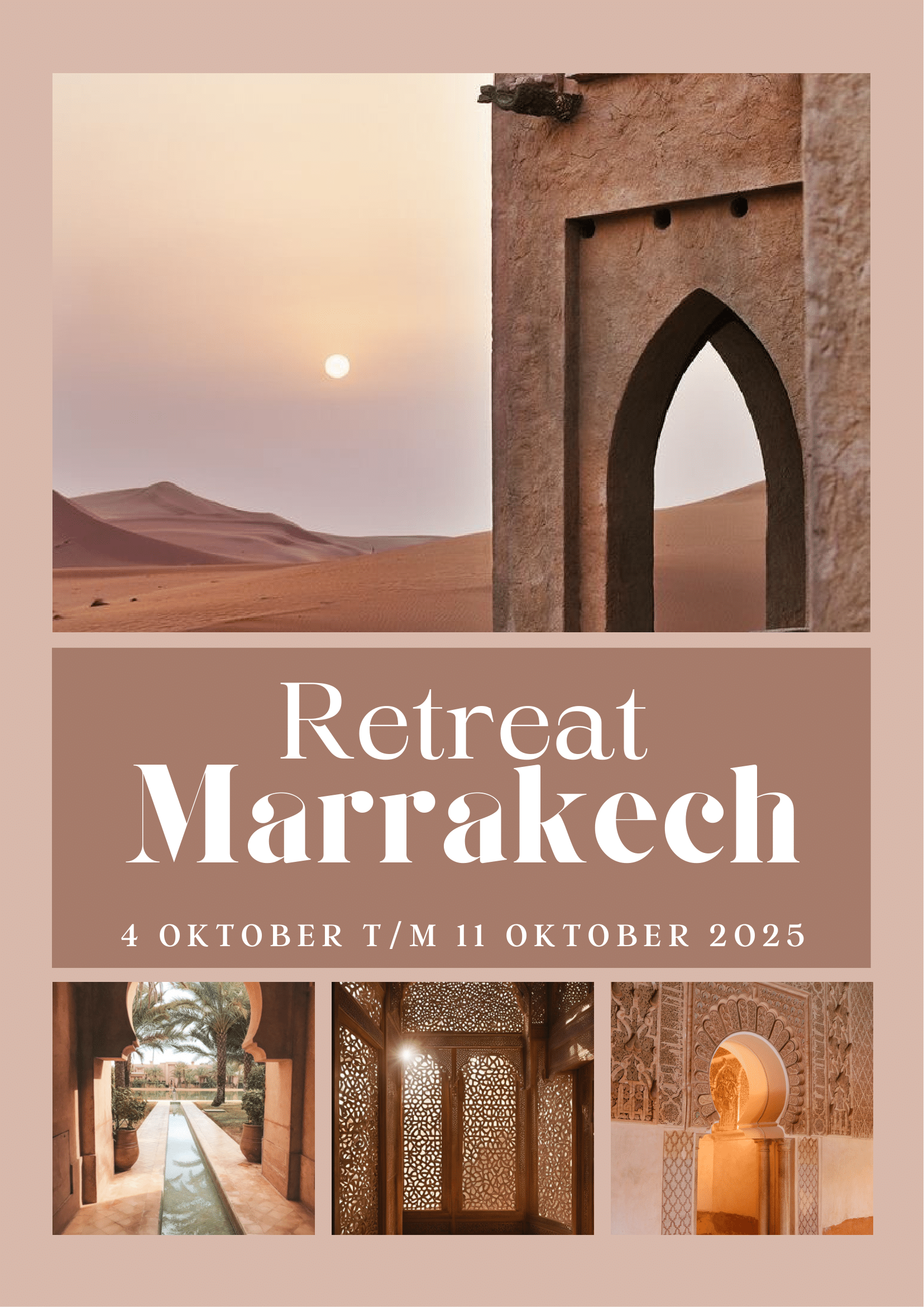 Na deze dagen van diepe ontspanning, reflectie en verbinding keer je terug naar huis met een lichter hart, een heldere geest en een diepere connectie met jezelf. Marrakech heeft je betoverd, maar bovenal heb jij jezelf opnieuw ontdekt.